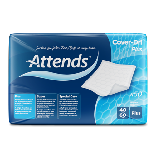 Attends Cover-Dri Plus är en serie absorberande hygienunderlägg utformade för att användas i sängar, stolar och rullstolar som komplement till inkontinensskydd där risk för läckage finns. Serien har friktionsplast på undersidan som håller skydden på plats samt ett mjukt ytskikt med hexagonalt formade kuddar som absorberar vätska snabbt samtidigt som de korta kanalerna mellan kuddarna begränsar vätskespridningen. Runt hela skyddet finns spärrkanter för att förhindra läckage utanför skyddet.
