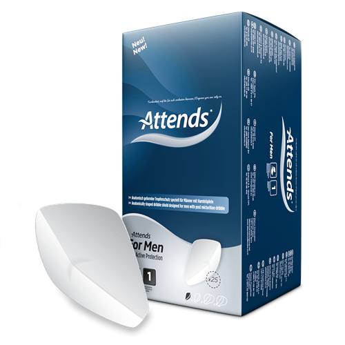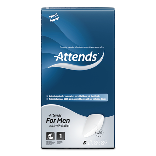 Attends For Men 1 ingår i en serie av små anatomiskt utformade skydd speciellt utvecklade till män för att hantera lätt urininkontinens och efterdropp. Högabsorberande skydd för ökad läckagesäkerhet, torrhet och minskad lukt samt fästytor som säkerställer att produkterna sitter säkert i tätt åtsittande underkläder alternativt fixeringsbyxor.
