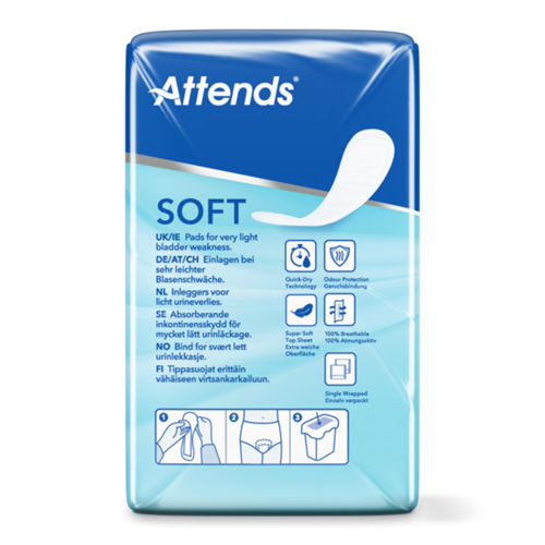 Attends Soft 1 Mini är diskreta, anatomiskt utformade skydd för mycket lätt urininkontinens. Produkten är speciellt utvecklad för dig med känslig hud.