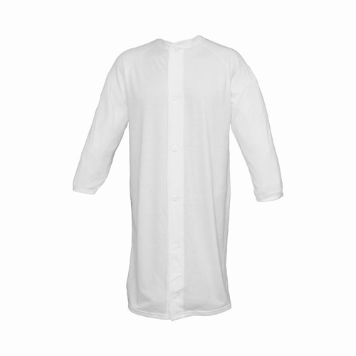 Bäddskjorta för patient med raglanärm och knäppning framtill. Halsringning i muddtrikå.