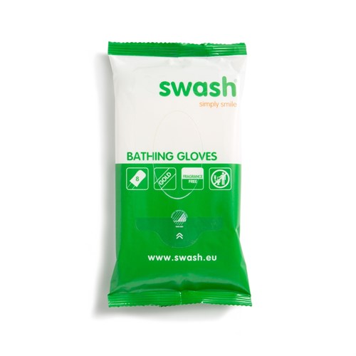 Swash® Gold Glove, är luddfria och mjuka tvätthandskar som i förväg är fuktade och impregnerade med en särskild lotion som rengör och samtidigt ger näring åt huden till patienter med nedsatt rörlighet. Handskarna ger en skonsam och behaglig tvätt för personer med ömtålig hud och gör det lättare att rengöra svåråtkomliga kroppsdelar, som hudveck. Varje del av kroppen tvättas med separat tvätthandske, som sedan kastas. Huden behöver inte sköljas eller torkas av. Levereras i en förpackning om 8 st tvättlappar.