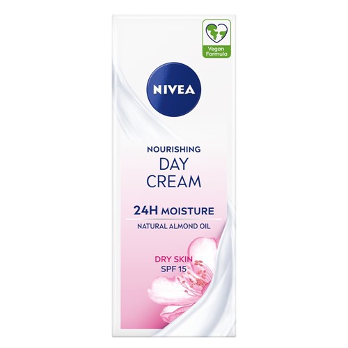 NIVEA Nourishing Day Cream är en dagkräm utvecklad för att vårda torr hud. Formulan med NIVEA Moisture care complex och naturlig mandelolja återfuktar huden intensivt i upp till 24 timmar och balanserar hudens egen fuktnivå. Denna NIVEA ansiktskräm ger näring på djupet och jämnar ut din hud samtidigt som den skyddar den från yttre påfrestningar. Dagrämen innehåller även SPF 15 som skyddar mot skador orsakade av solen. Applicera denna återfuktande NIVEA dagkräm på rengjort ansikte genom att försiktigt massera i små cirklar. Undvik direkt ögonkontakt. Denna ansiktsvård har en vegansk formula - fri från animaliska ingredienser. NIVEA Nourishing Day Cream är dermatologiskt testad.