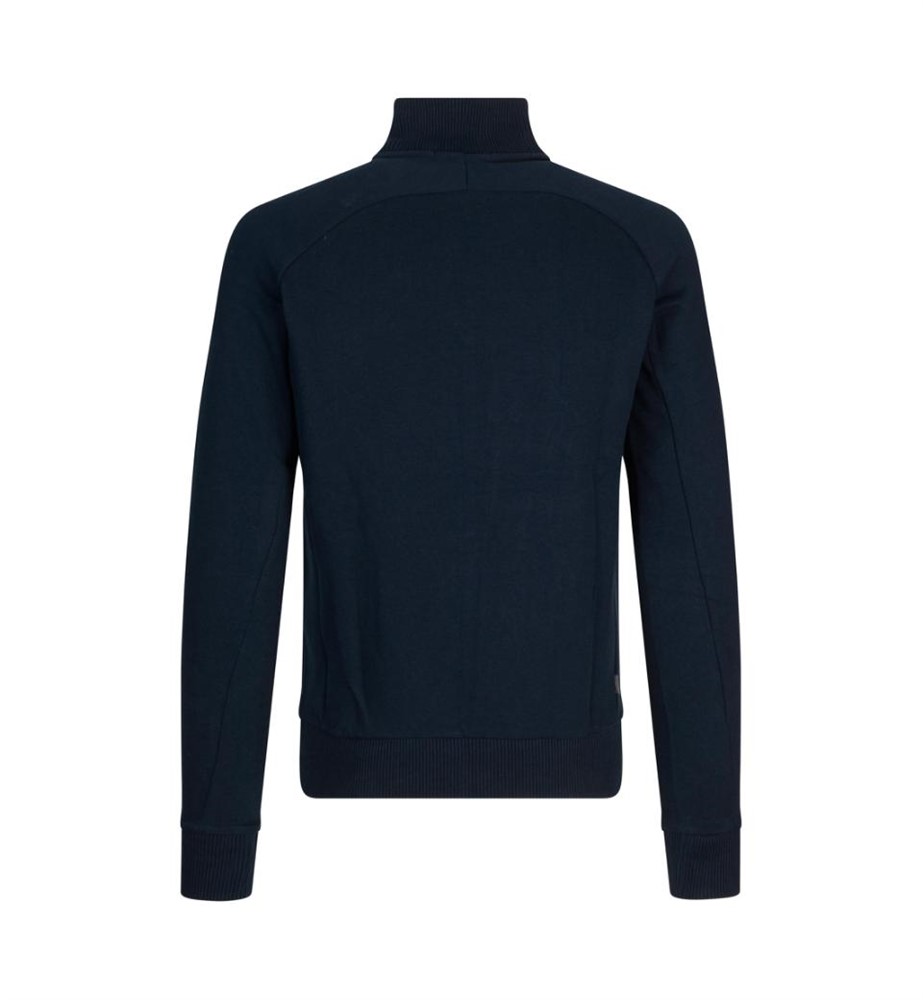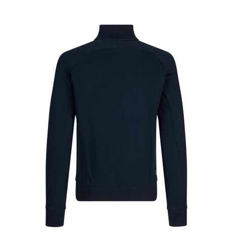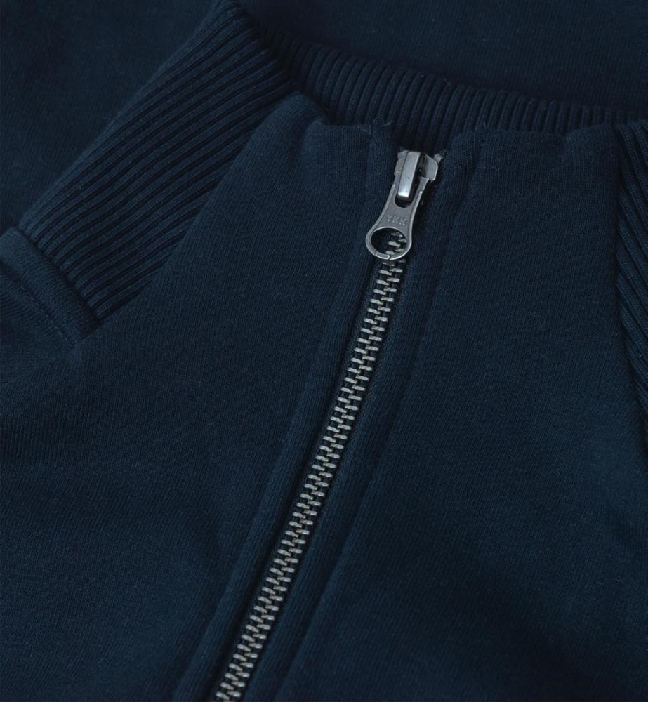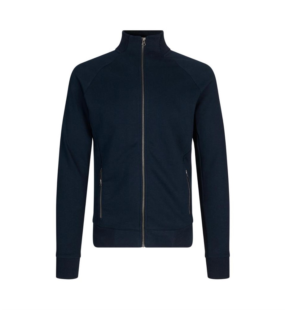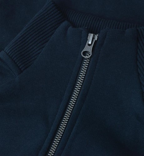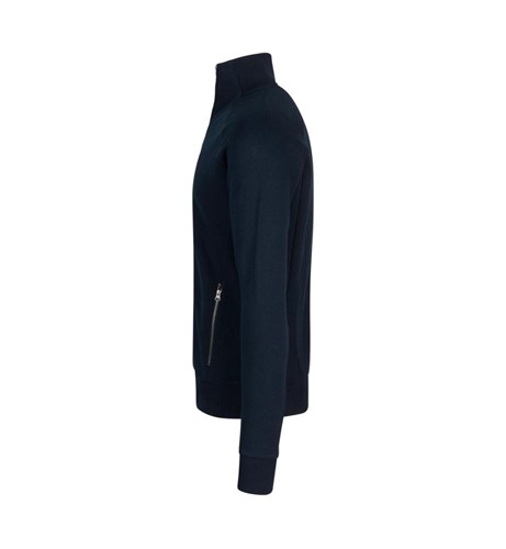 Cardigan i sweatshirt-kvalitet med borstad insida. Hel knäppning fram med blixtlås. Hög krage och två fickor fram. Mudd i ärmslut och nederkant.