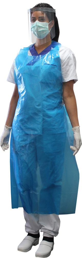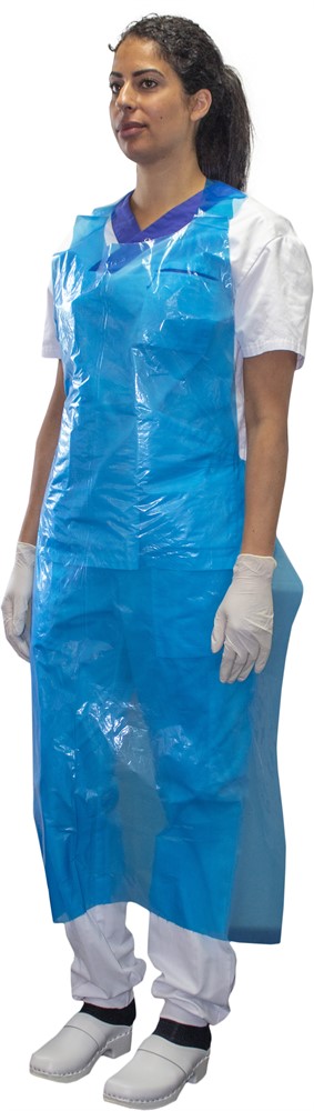 Slitstarkt engångsförkläde/duschförkläde tillverkad av polyeten. Blockad för lättare hantering.