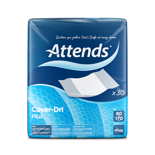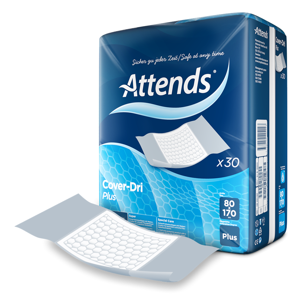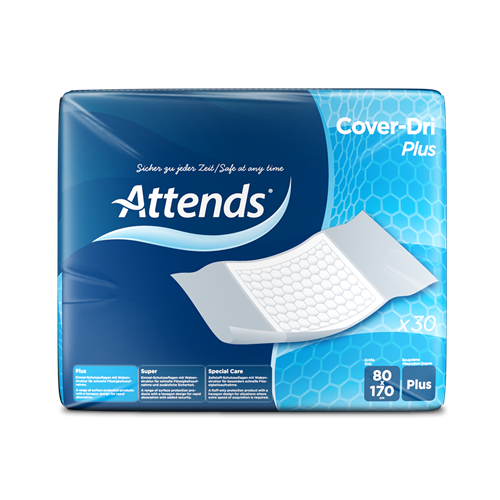 Attends Cover-Dri Plus är en serie absorberande hygienunderlägg utformade för att användas i sängar, stolar och rullstolar som komplement till inkontinensskydd där risk för läckage finns. Serien har friktionsplast på undersidan som håller skydden på plats samt ett mjukt ytskikt med hexagonalt formade kuddar som absorberar vätska snabbt samtidigt som de korta kanalerna mellan kuddarna begränsar vätskespridningen. Runt hela skyddet finns spärrkanter för att förhindra läckage utanför skyddet.