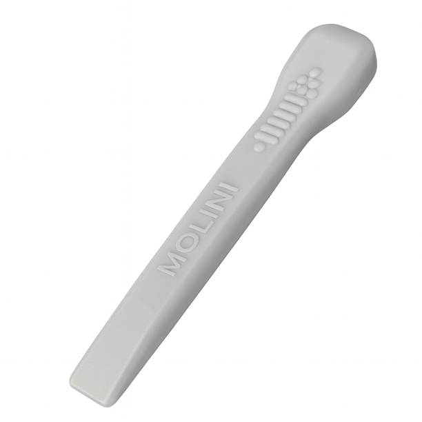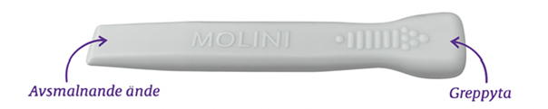 Molini-verktyget är tillverkat av hård plast och har en avsmalnande spets som gör införandet enklare. Det är särskilt lämpligt när patienten inte vill eller kan öppna munnen själv.