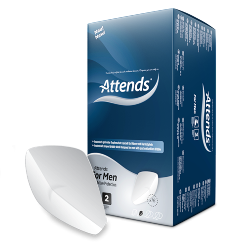 Attends For Men 2 ingår i en serie av små anatomiskt utformade skydd speciellt utvecklade till män för att hantera lätt urininkontinens. Högabsorberande skydd för ökad läckagesäkerhet, torrhet och minskad lukt samt fästytor som säkerställer att produkterna sitter säkert i tätt åtsittande underkläder alternativt fixeringsbyxor.