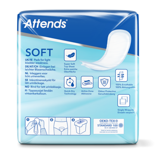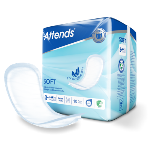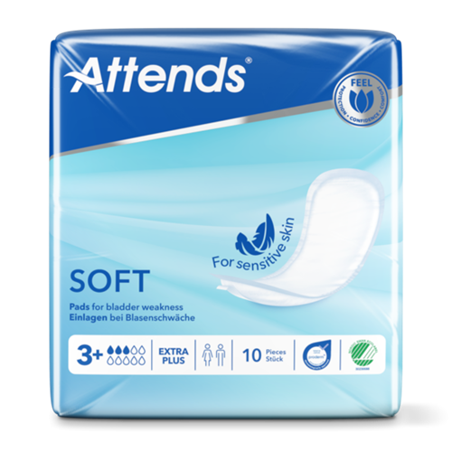 Attends Soft 3+ Extra Plus är diskreta, anatomiskt utformade skydd för lätt urininkontinens. Produkten är speciellt utvecklad för dig med känslig hud.