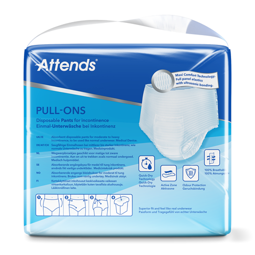 Attends Pull-Ons 6 är mjuka, diskreta engångsbyxor med känslan av vanliga underkläder. De kan lätt tas upp och ner och de är utformade för att hantera medel till tung inkontinens. Attends Pull-Ons ger en kroppsnära och följsam passform för extra komfort. Den absorberande kärnan skyddar mot läckage och lukt, för ett aktivt liv med känslan av trygghet.