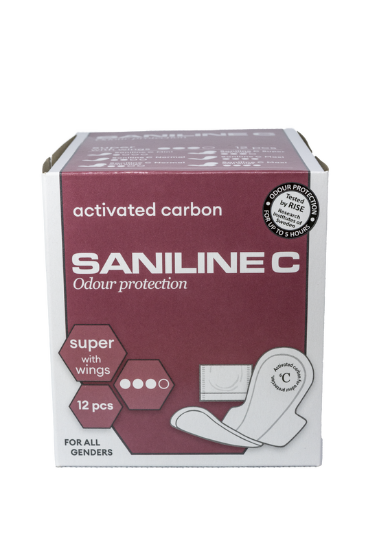 Saniline C Super med vingar är ett unikt specialskydd för små avföringsläckage, så som kluttar eller soil.