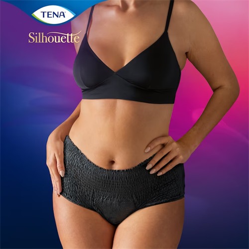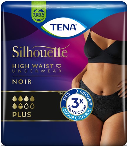 Nu behöver du inte välja mellan säkerhet och stil. De eleganta, svarta absorberande engångsunderkläderna TENA Silhouette Plus Noir ger ett effektivt skydd mot medelstora till mycket stora urinläckage. De är svarta rakt igenom vilket gör att de ser ut precis som trosor och är diskreta med en modern design. Tack vare det mjuka och andningsbara materialet sitter de bekvämt och säkert medan den pålitliga kärnan med plus-absorption snabbt kapslar in även större läckage. Din hud förblir torr och lukt neutraliseras så att du känner dig fräsch och feminin.