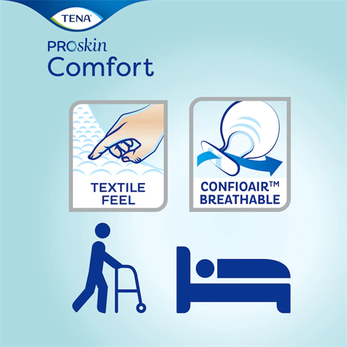 TENA Comfort Ultima är ett bekvämt, extra långt och skålformat inkontinensskydd för dig som behöver en mycket absorberande inkontinensprodukt och vill fortsätta använda bindor. Den här stora bindan har hög absorptionsförmåga som du kan lita på och som skyddar dig vid plötslig total tömning av blåsan och under natten. Den unika skålformen ger en säker passform som skyddar mot läckage. Systemet FeelDry Advanced™ tar snabbt bort vätskan från ytan så att huden förblir torr. Den snabbabsorberande kärnan kapslar in urin, även i större mängder, samtidigt som den andningsbara ConfioAir-baksidan låter huden andas. Alla dessa egenskaper bidrar till att bevara en naturlig hudhälsa. Detta säkra inkontinensskydd sitter på plats med hjälp av TENA Fix fixeringsbyxor. TENA ProSkin Comfort kan tas på stående eller liggande och är lätt att få på plats och att byta.