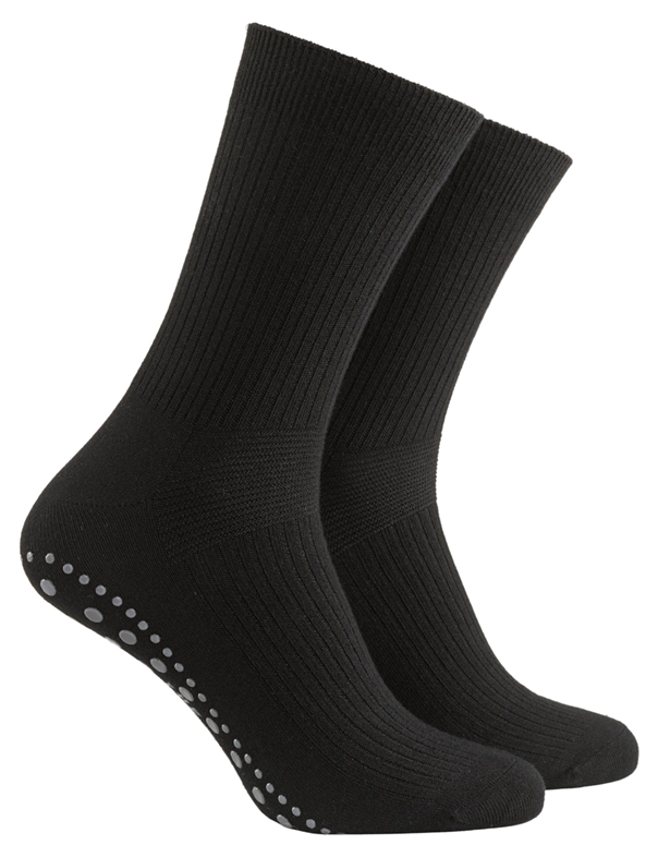 Socka med anti-halkskydd ger foten bättre grepp och skyddar mot hala underlag inomhus. Viktigt för personer med sämre balans, nedsatt styrka och/eller för de som lider av yrsel. Lös resår i skaftet för extra komfort. Halkskydd i 100% silikon.