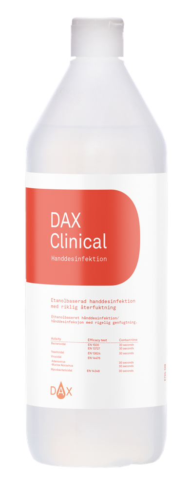 DAX Clinical Handdesinfektion är en hygienisk, flytande handdesinfektion som är utprovad i samarbete med svensk sjukvård. Produkten är effektiv mot bakterier, jästsvamp, mykobakterier och många typer av virus som t.ex. Coronavirus, Adenovirus och Murine Norovirus.