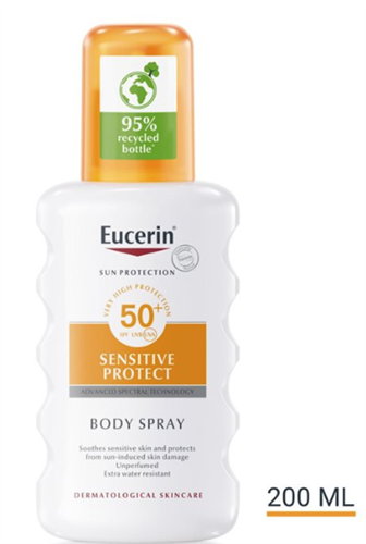 Eucerin Sun Spray SPF50+ har kliniskt och dermatologiskt visat sig vara lämplig för känslig hud.